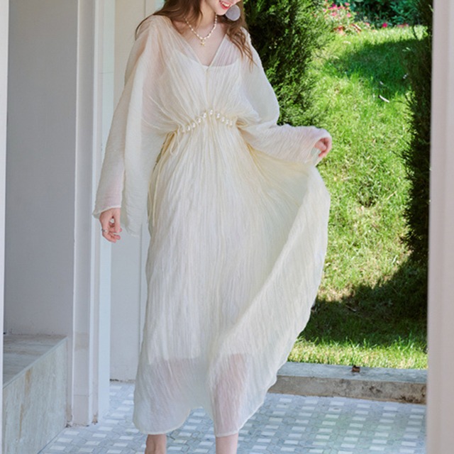 Handmade acetate wrinkle pearl pleated waist dress K00045