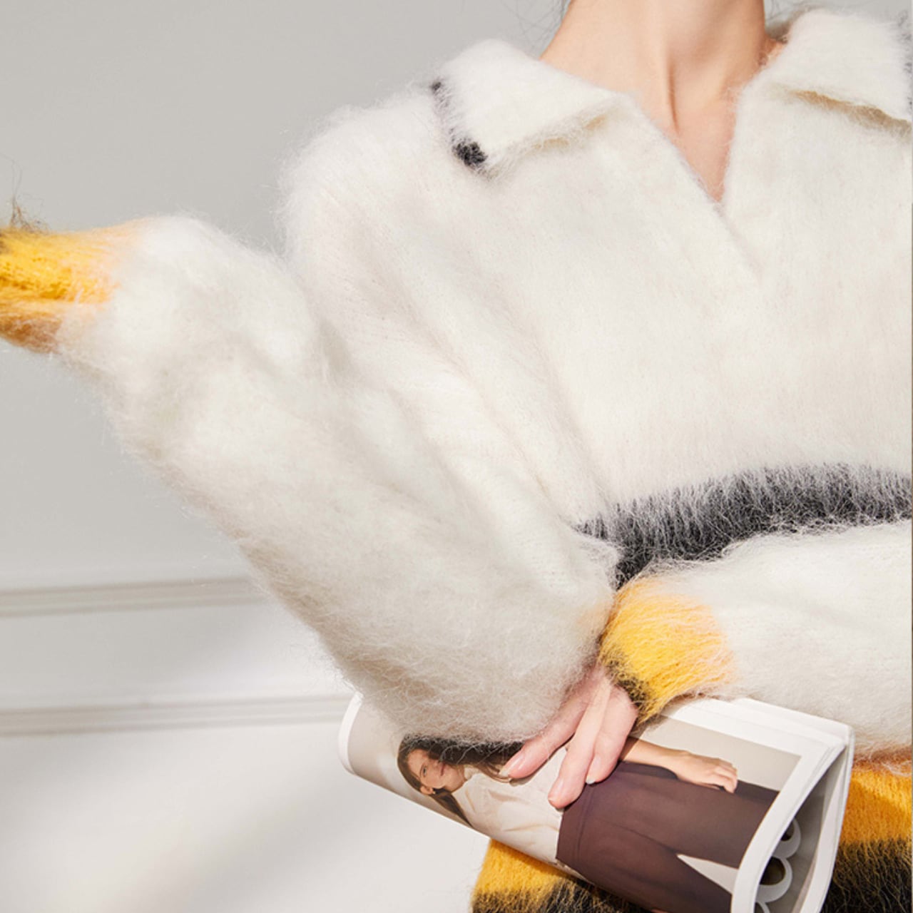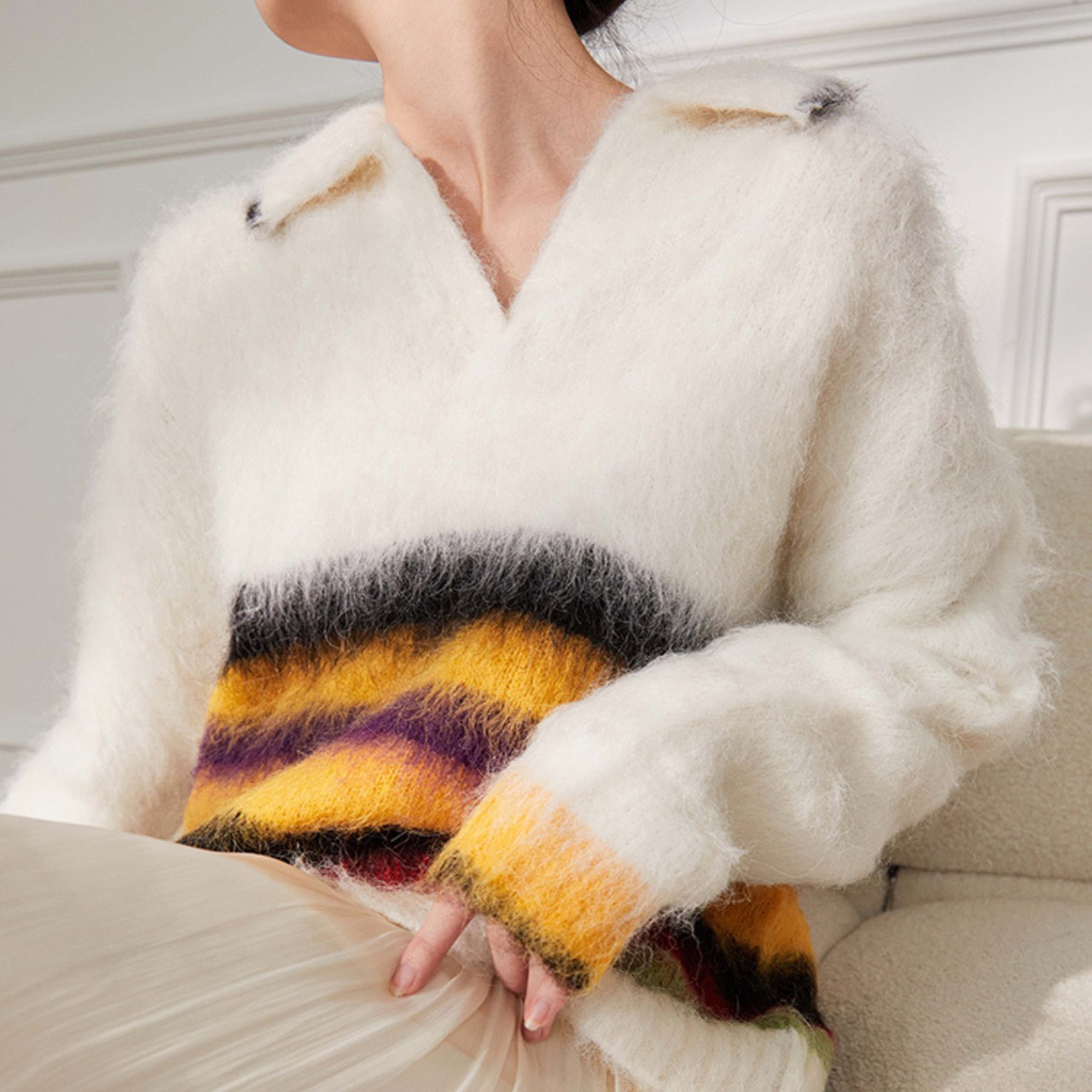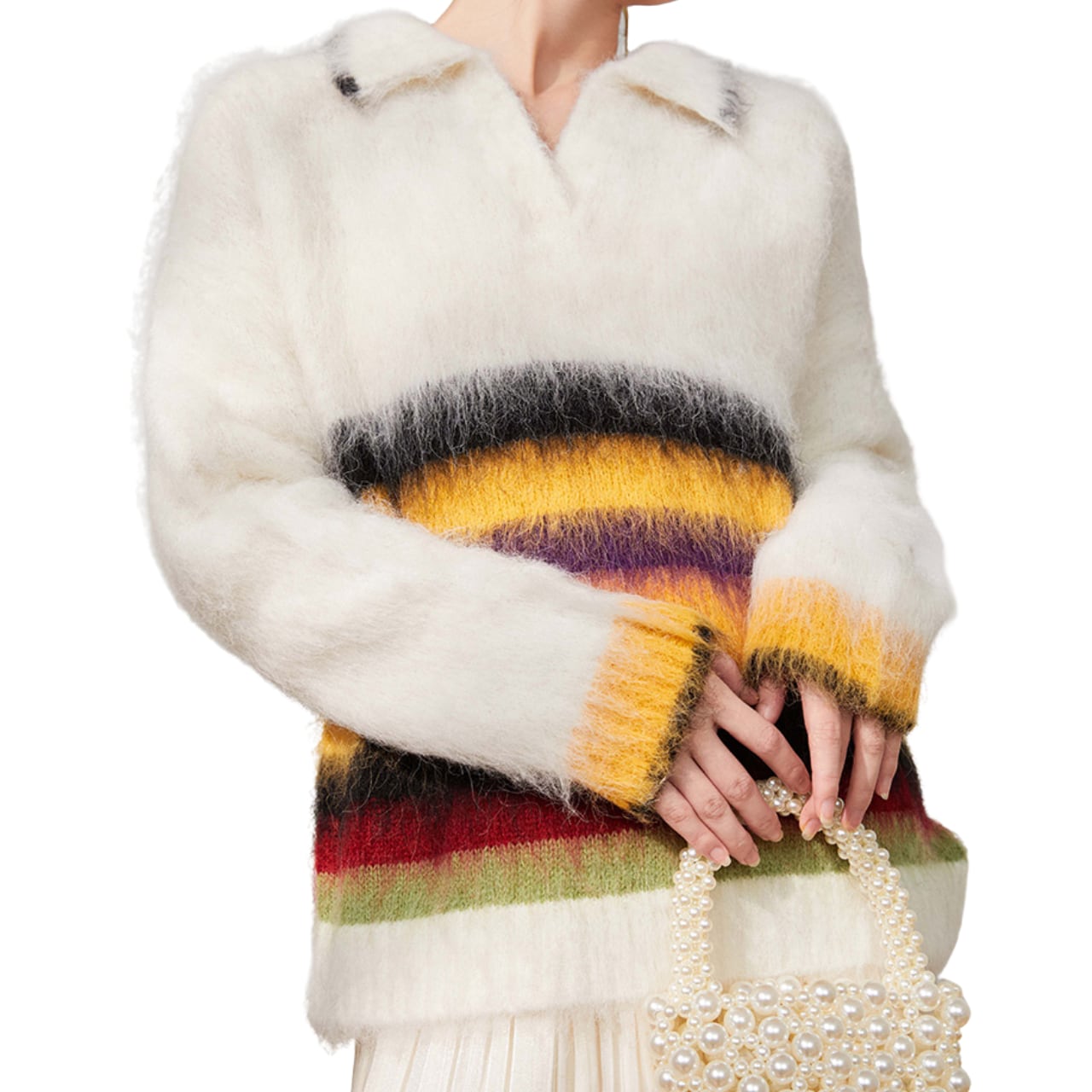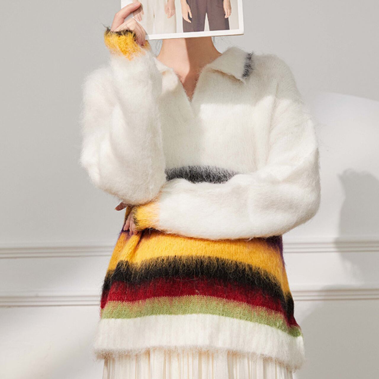 温もりと個性を両立させたセーターです。カラフルなストライプ柄が目を引き、コーディネートのアクセントとなる一着です。カジュアルスタイルはもちろん、ちょっとしたお出かけにもぴったりで、デイリーユースにも最適なアイテムです。温かさを保ちながらも、トレンド感を失わないデザインが多様なシーンでの活躍を約束します。
