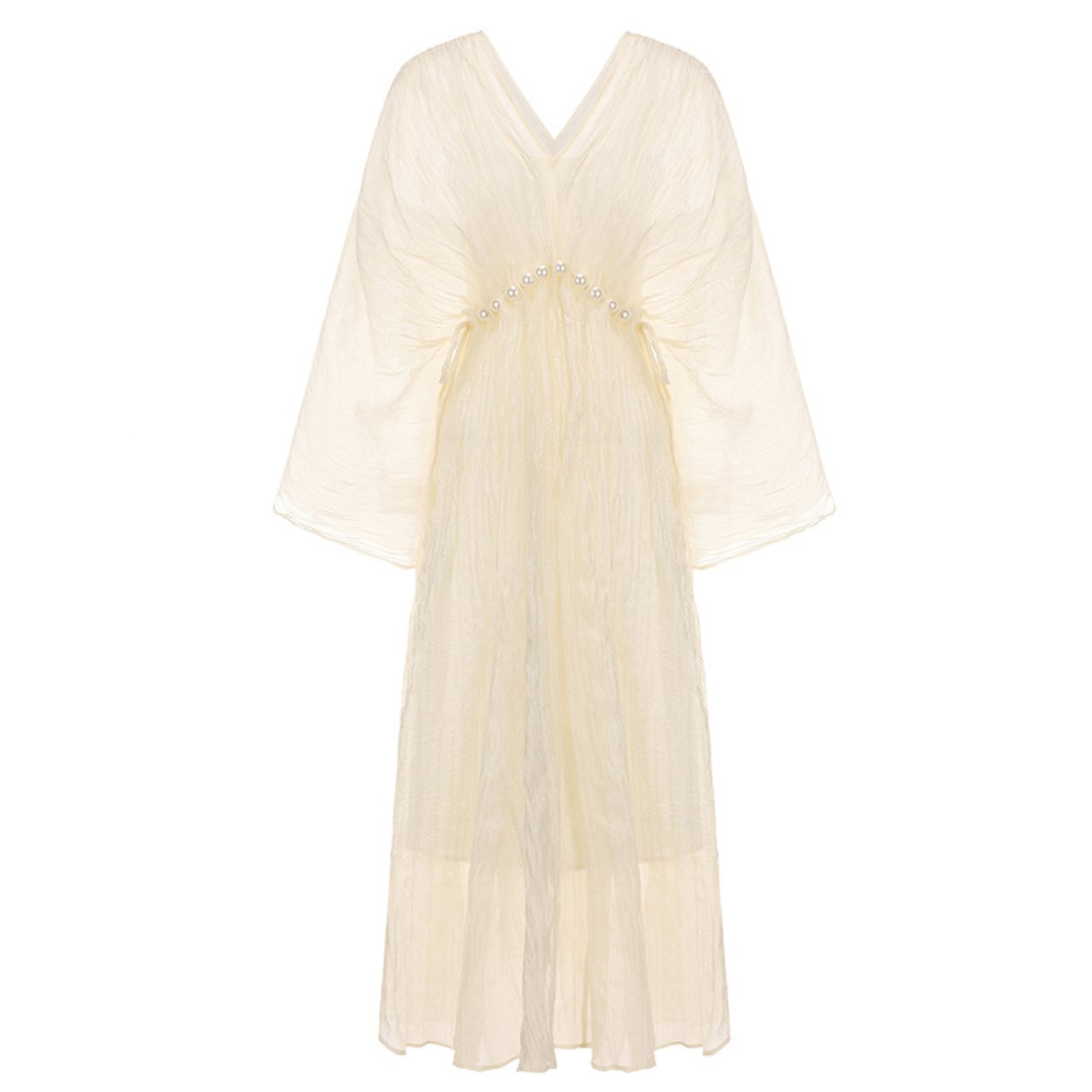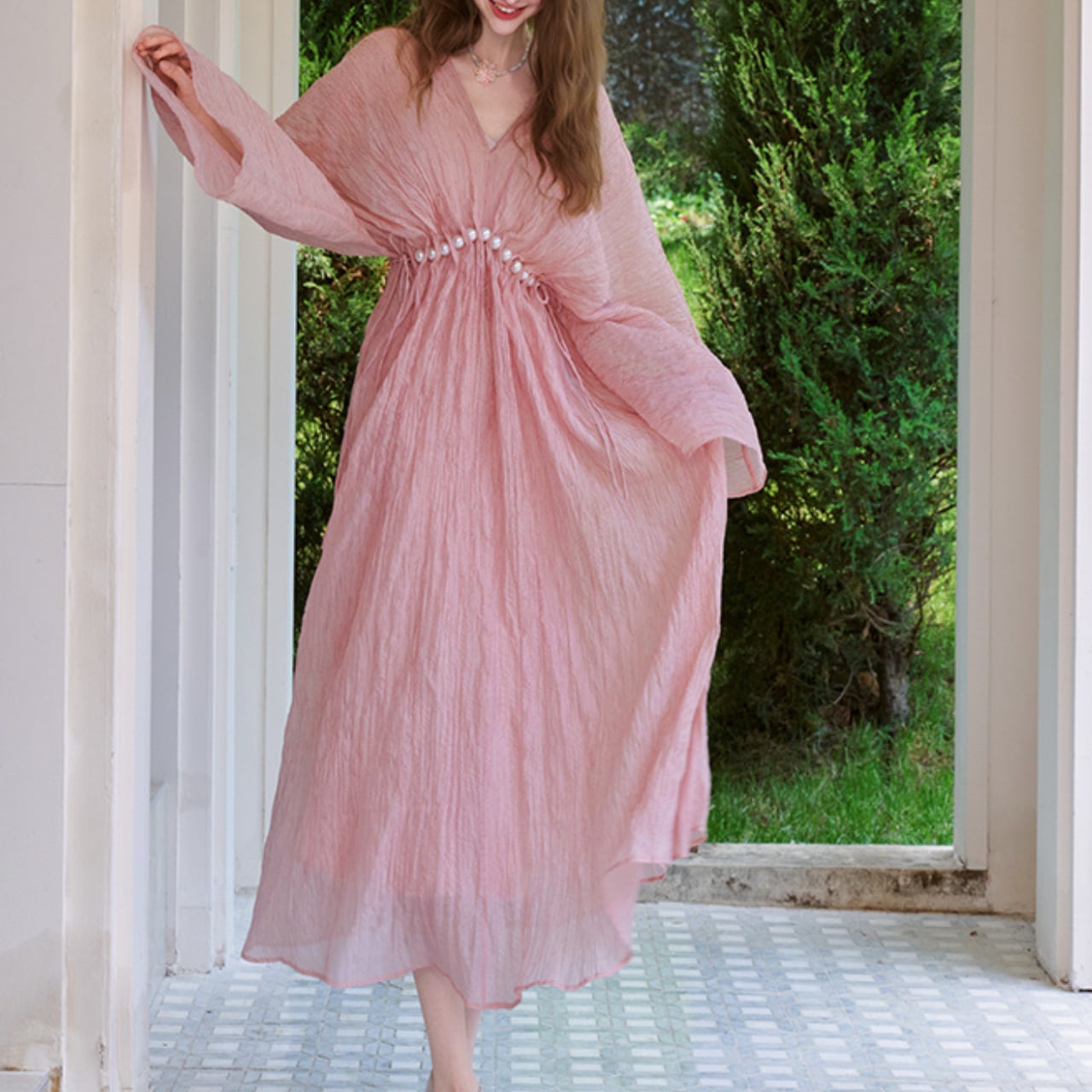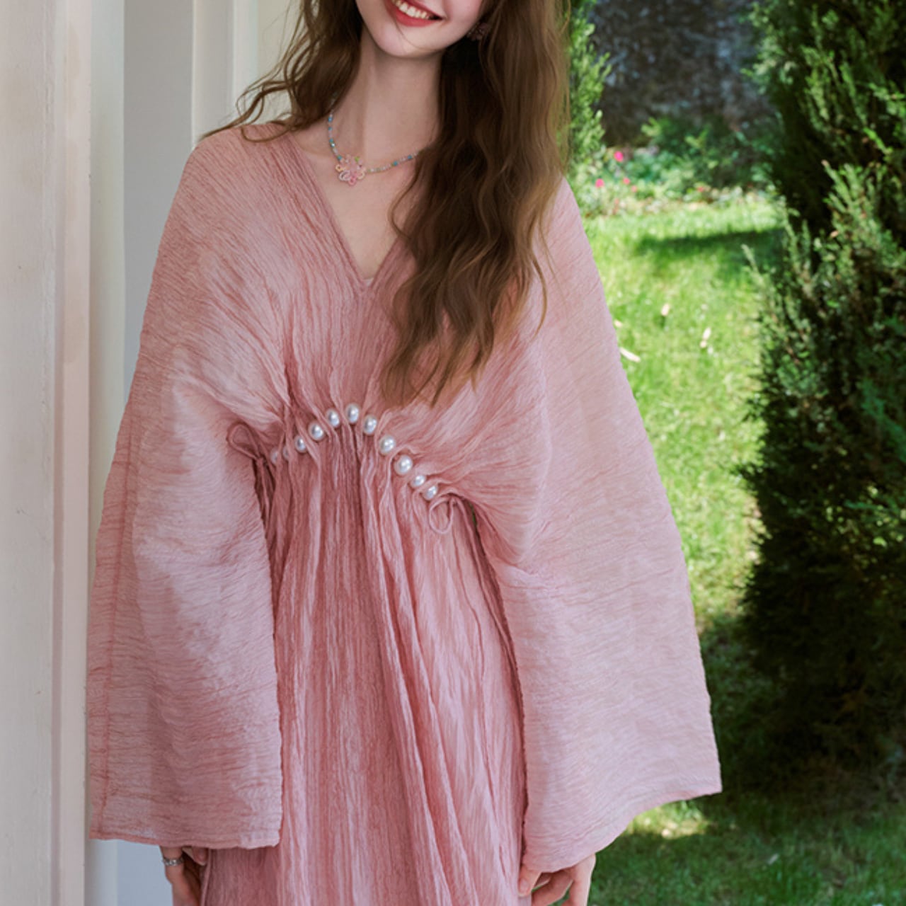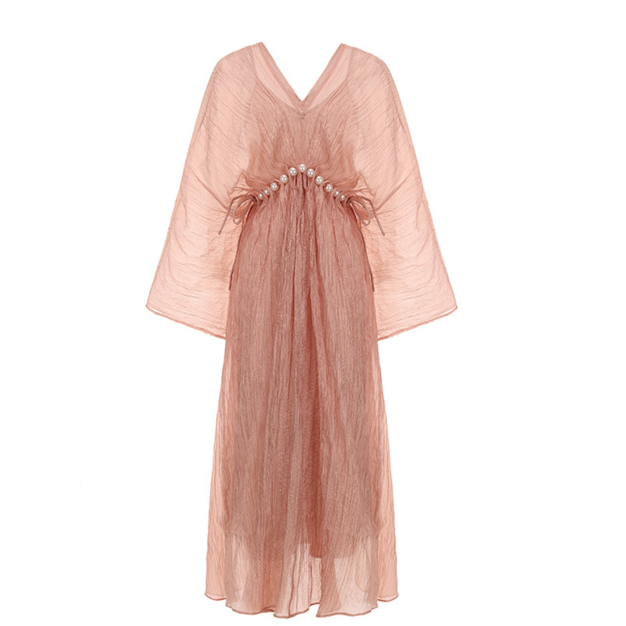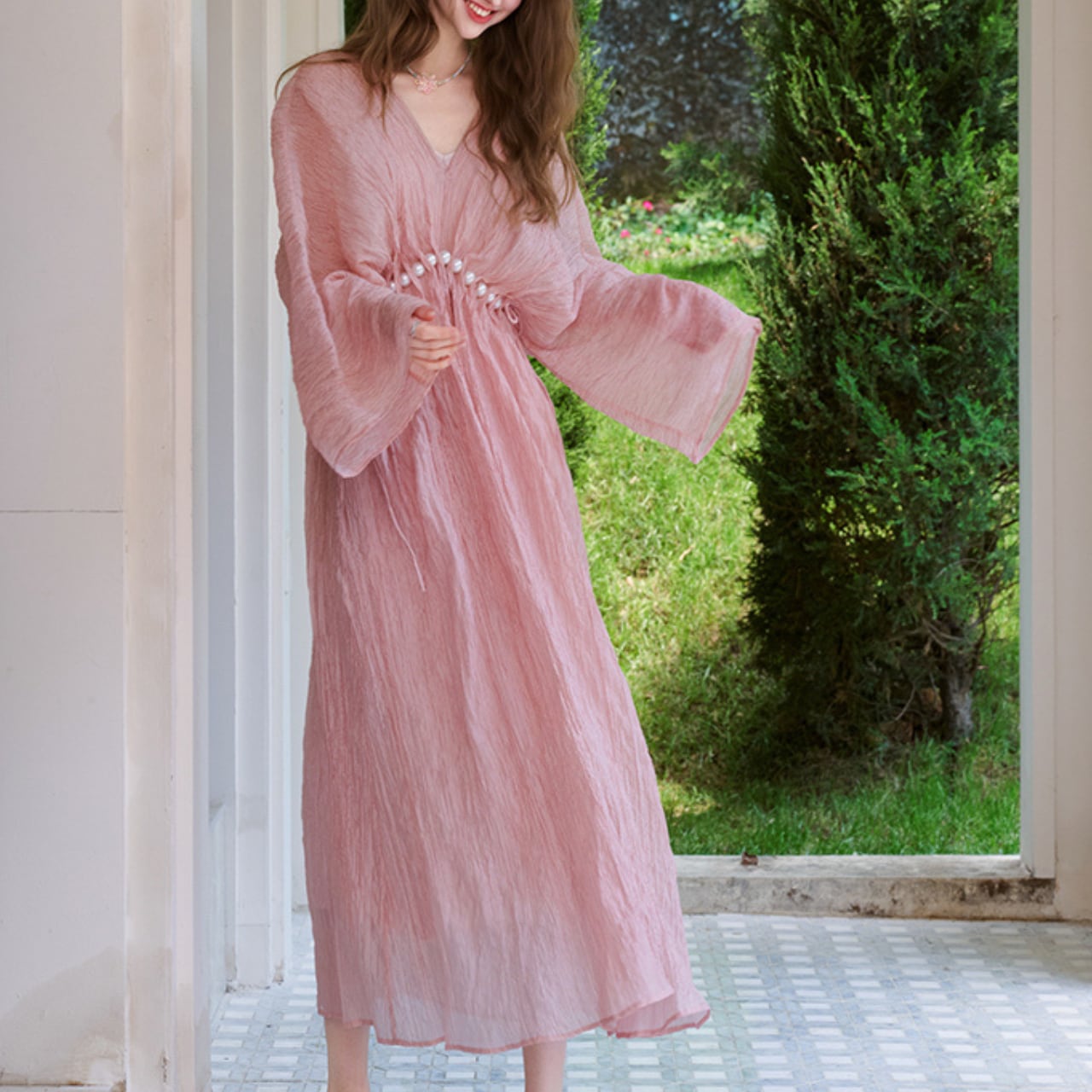 Handmade acetate wrinkle pearl pleated waist dress K00045