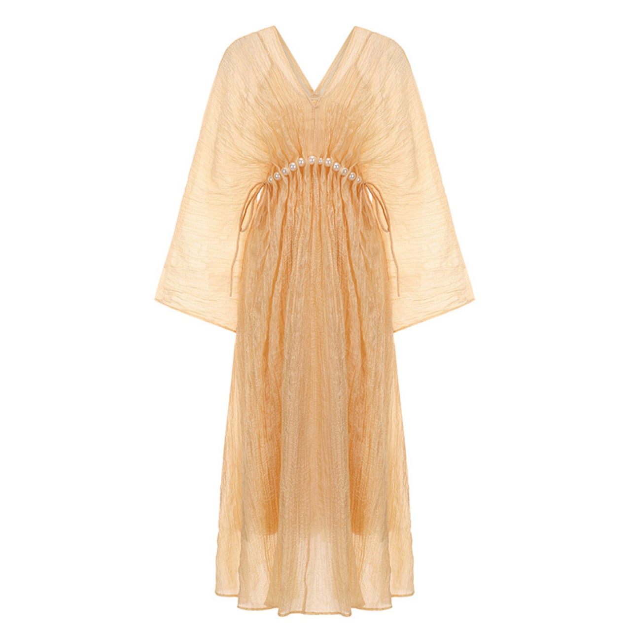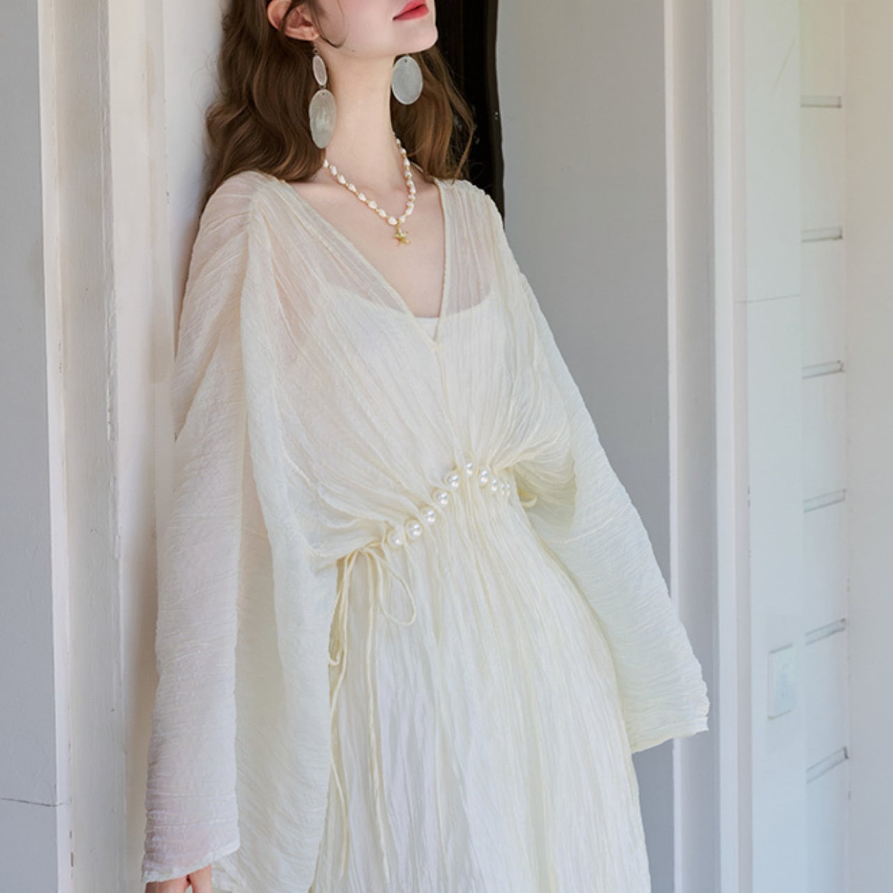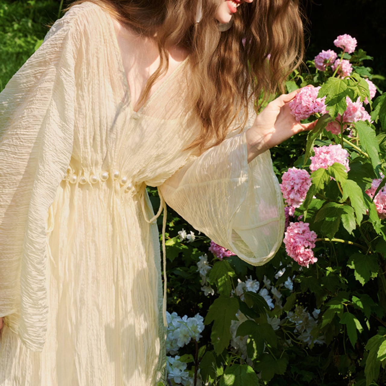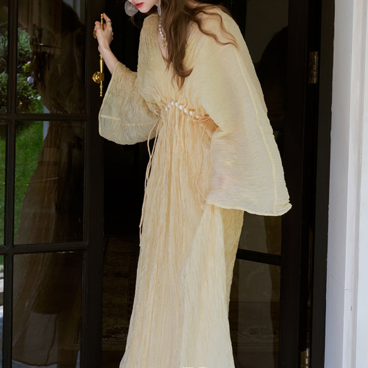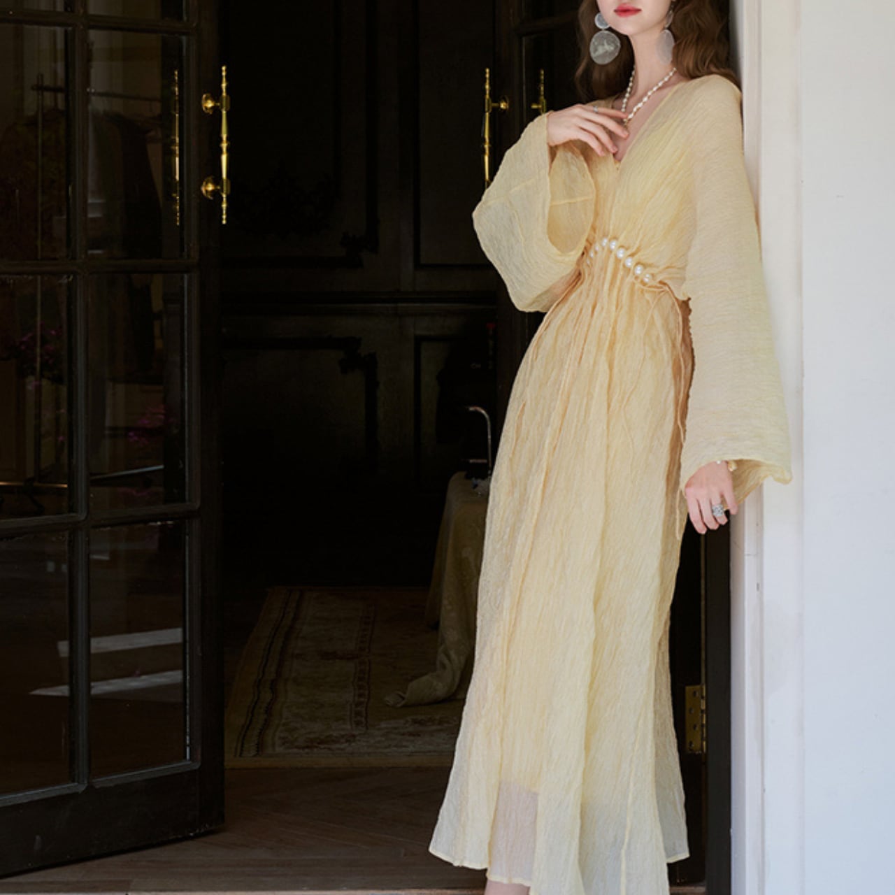 Handmade acetate wrinkle pearl pleated waist dress K00045