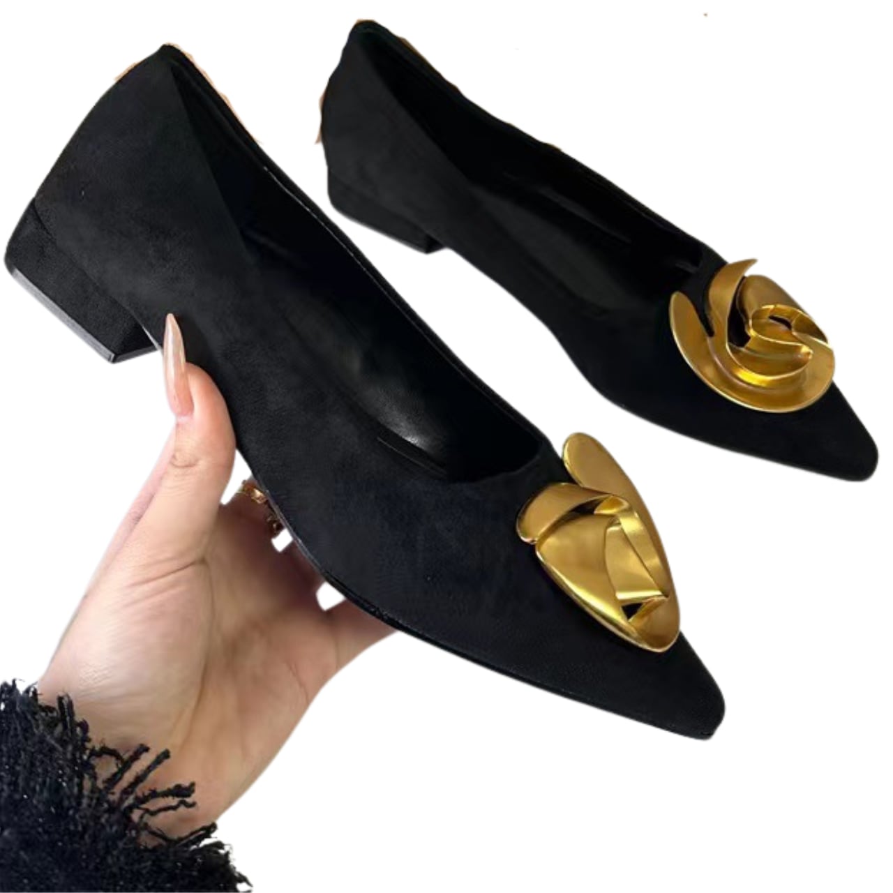 洗練されたデザインが魅力的なフレンチハイエンドフラットシューズは、スタイリッシュなポインテッドトゥとシャロウマウスが特徴です。上質な合成皮革を使用しており、柔らかな履き心地を実現。このシューズには華やかなメタルフラワーの装飾が施されており、シンプルなコーディネートに洗練されたアクセントを加えます。カジュアルからフォーマルまで幅広いシーンでご利用いただけるデザインで、あなたの足元を美しく演出すること間違いありません。