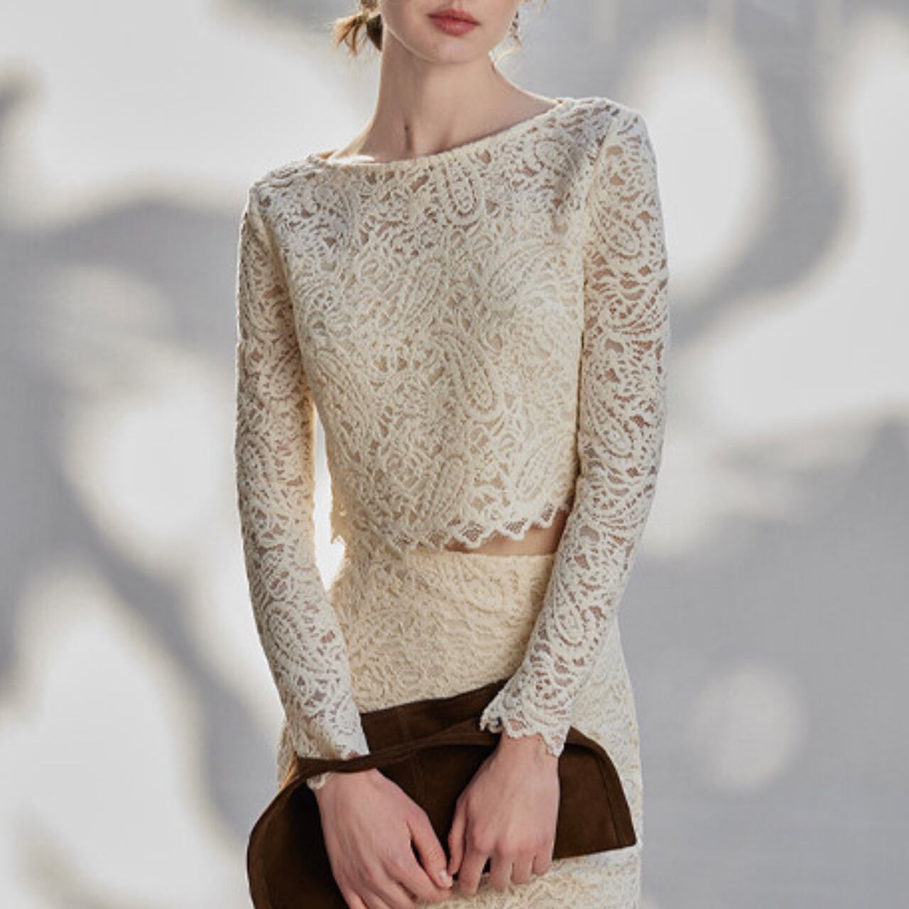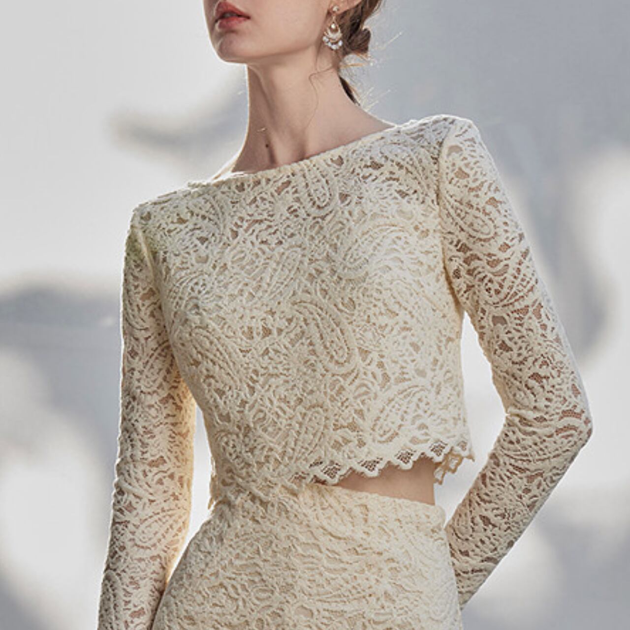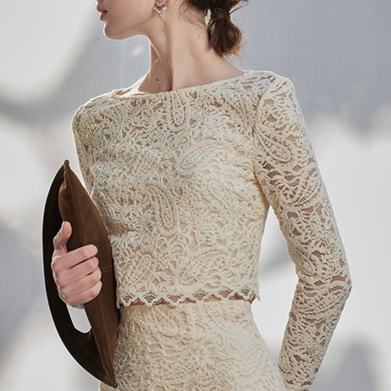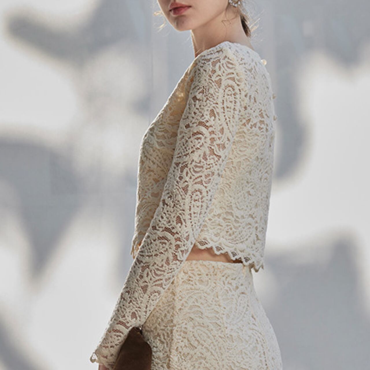 このセットアップは、華やかさとフェミニンさを兼ね備えた一着です。柔らかなベロア素材に施されたレースが、エレガントな雰囲気を醸し出します。クロップド丈デザインは、ハイウエストボトムスとの相性が抜群で、スタイルを引き立ててくれます。デートやパーティーなど特別なシーンにぴったりなアイテムで、さらなる魅力を引き出してくれること間違いなしです!